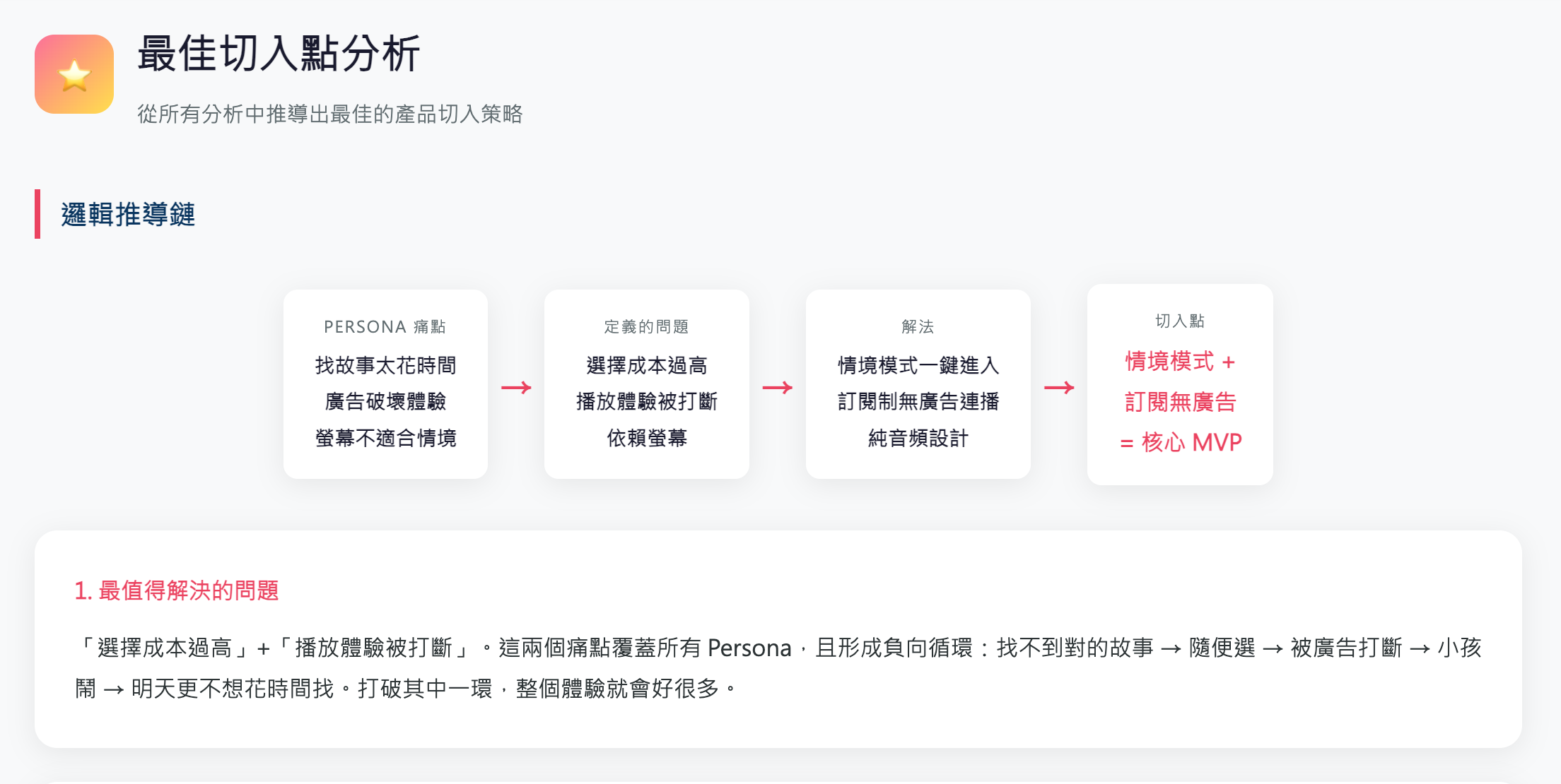 他不是單純的請 AI 角色扮演某個厲害的產品經理想 idea,而是經歷一套「設計思考」+「產品定位」方法論後的結果。